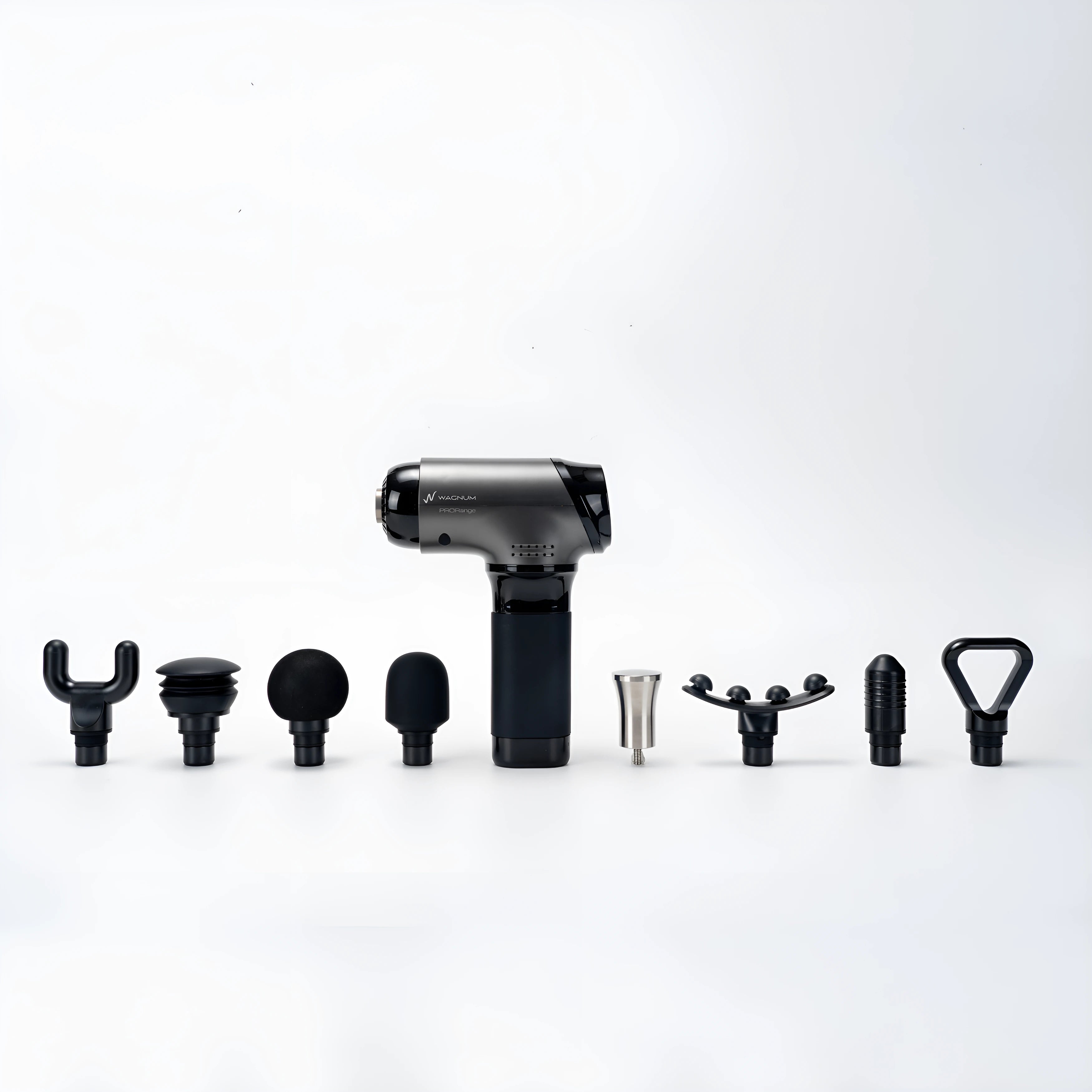 Engineered for genuine deep tissue recovery, the WAGNUM PRO Range Massage Gun delivers an 18 kg stall force and innovative adjustable amplitude technology, allowing precise stroke intensity from 8 mm to 12 mm across five powerful levels. Experience optimised recovery with its extended battery life, precision interface displaying real-time feedback, and a comprehensive set of eight specialised attachment heads meticulously designed for every muscle group and therapeutic need.